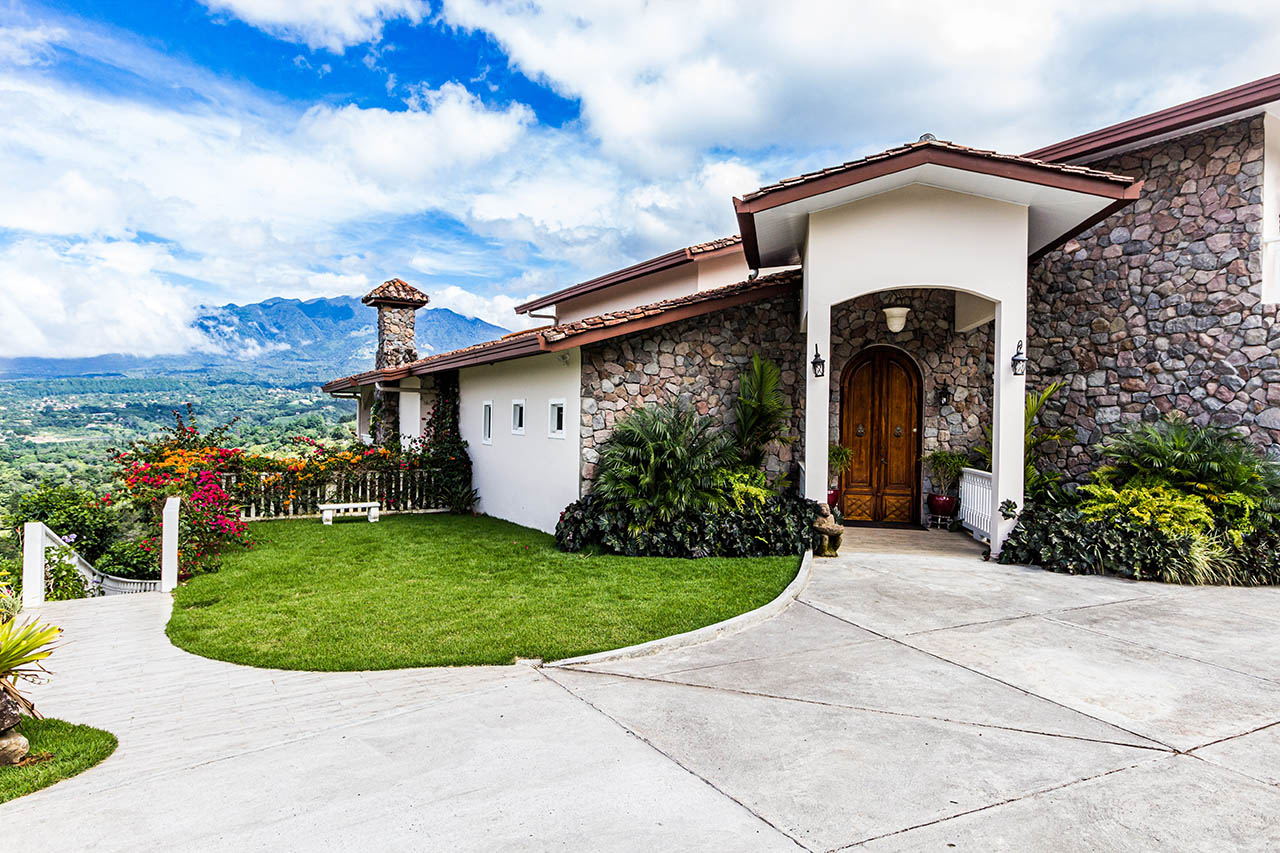 Natural stone façades, a pitched roof, and carefully landscaped gardens give the home a timeless character. The gently sloping driveway leads to a welcoming entrance, while large windows frame the surrounding greenery and distant mountain views.